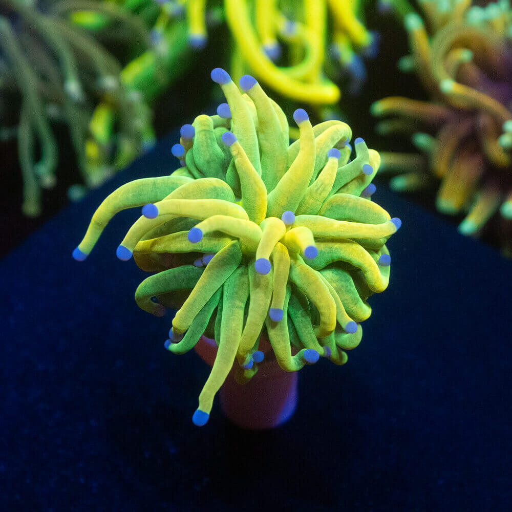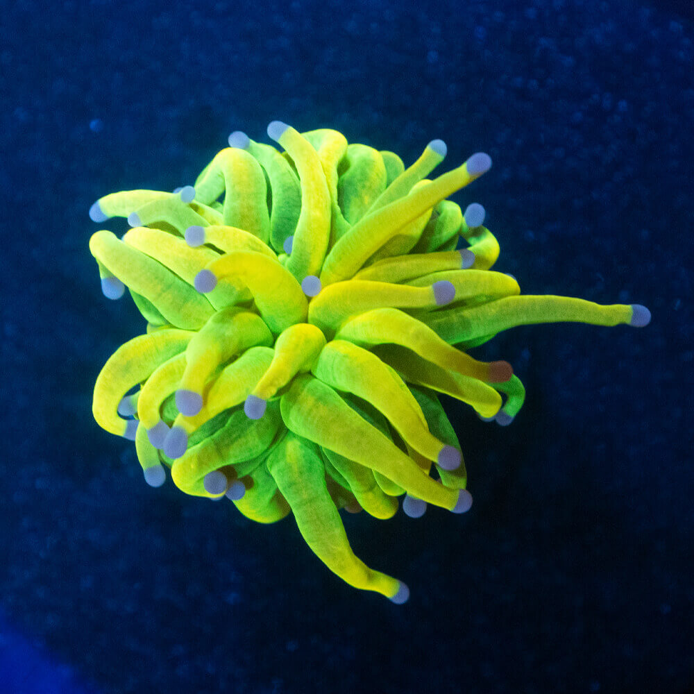 Our Euphyllia glabrescens “Holy Grail” is an impressive LPS coral (Large Polyp Stony Coral) known for its solid gold-green coloration. This rare and striking variety is a true highlight in any colorful reef aquarium, bringing vibrant life and movement through its flowing tentacles.